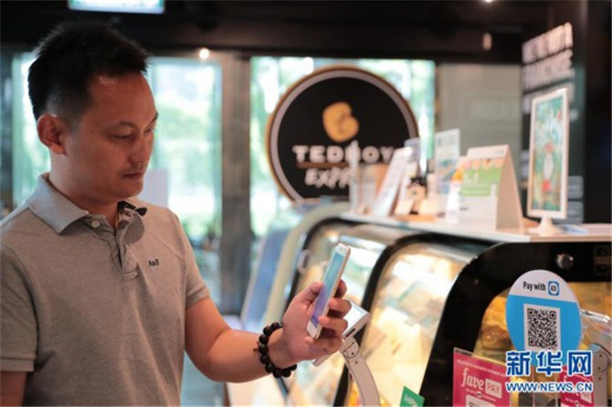 8月8日,在马来西亚吉隆坡,一名男士用电子钱包刷二维码买咖啡。去年,马来西亚主要支付服务提供商、联昌国际银行旗下的Touch‘n Go(TnG)与中国企业蚂蚁金服结成战略合作伙伴。今年5月,他们联合推出的电子钱包产品投入运行。这款产品不仅能实现手机充值、水电等缴费、转账、买机票等,还可在吉隆坡一条地铁线路的部分站点体验刷码过闸坐地铁。新华社记者 朱炜 摄