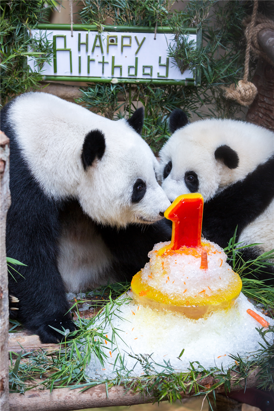 1月14日,在马来西亚吉隆坡附近的马来西亚国家动物园,大熊猫宝宝(右)与妈妈“靓靓”一起过生日。