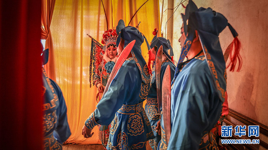 张德元是昆明市牛街庄业余滇戏班第四代掌班人,牛街庄素有“滇戏窝子”之称,村中的“牛街庄滇戏班”自清朝光绪年间就存在了,至今已有上百年的历史。牛街庄的第一批唱戏班子是由一位范姓人承头并联合周边滇剧爱好者参加组建起来的,之后牛街庄滇戏班主更迭,传到张德元这里时已是第四代了。图为在幕帘后准备登台的滇戏演员们。