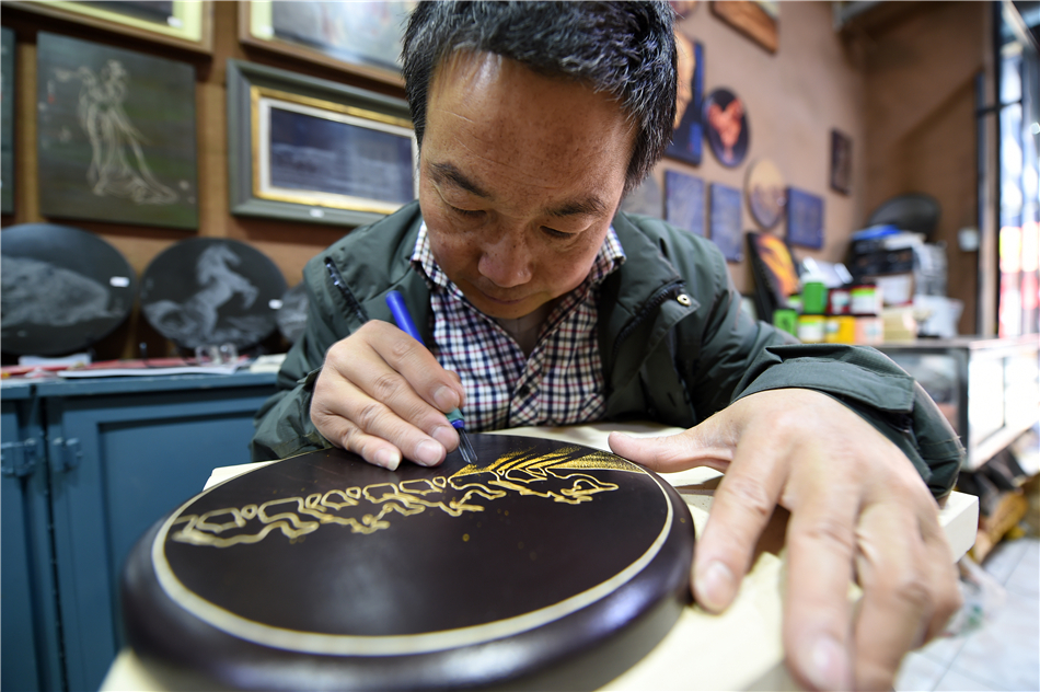 5月6日,申洪杰在敦煌市沙州市场的工作室内雕刻敦煌木刻画作品《大漠驼影》。 2004年,三十多岁的申洪杰从湖南老家第一次到敦煌旅游,就被莫高窟精美绝伦的壁画震撼,当地的大漠风情、边塞文化也让他流连忘返。深思熟虑后,喜欢木板雕刻的申洪杰决定移居敦煌,用刻刀把敦煌艺术展现在木板上,他这一干就是15年。 在申洪杰的刻刀下,飞天、佛教故事等敦煌艺术惟妙惟肖地展现在一块块大小不一的木板上。十多年间,申洪杰先后带过几十名徒弟,有些徒弟学成出师,也开了工作室雕刻敦煌木刻画。在申洪杰的带动下,敦煌木刻画越来越受到游客的青睐。“用刻刀把敦煌艺术雕刻在木板上,我想这是弘扬敦煌文化的一种方式”,申洪杰说,“我已经开始尝试纸上烙画、石刻画等新的表现形式,希望能够通过创新更好地传承和弘扬敦煌文化。”