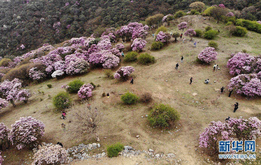 游客在云南大理马耳山杜鹃花海中赏花游玩。