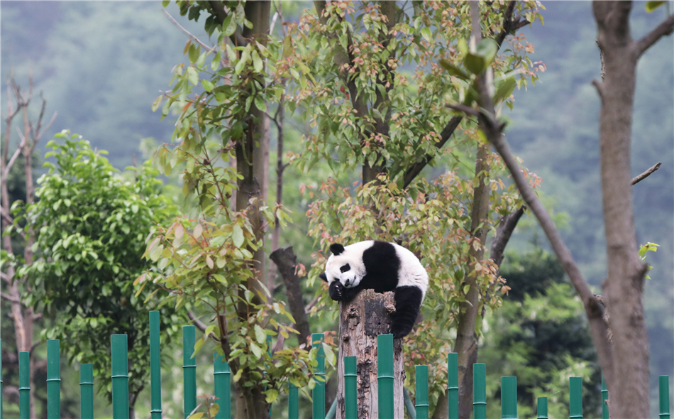 5月25日在中国大熊猫保护研究中心卧龙神树坪基地的“熊猫幼儿园”内拍摄的大熊猫。