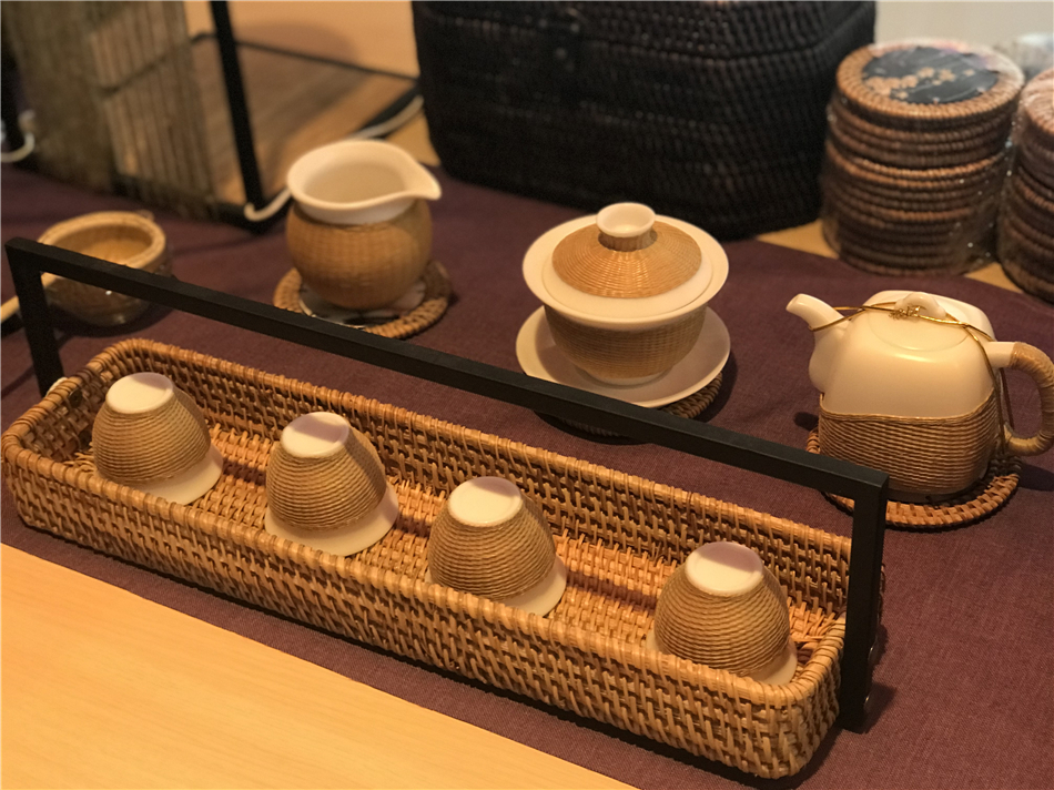 “传统+时尚”的竹丝扣瓷,将竹艺和瓷器结合起来制作成茶杯、茶具等产品,在展会上很受欢迎。