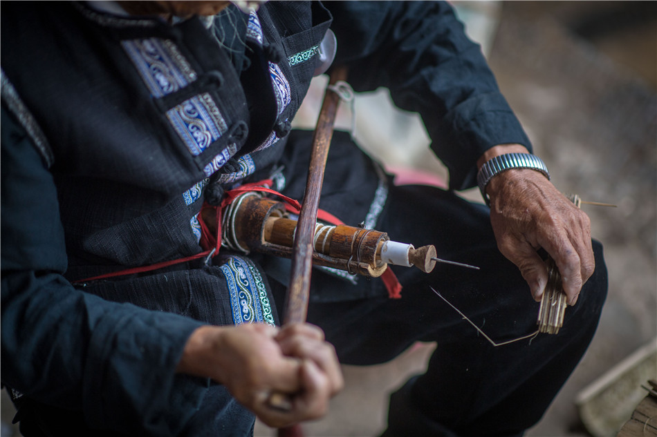 张荣华老人使用专门的工具为伞骨钻孔(7月9日摄)。新华社记者 江文耀 摄