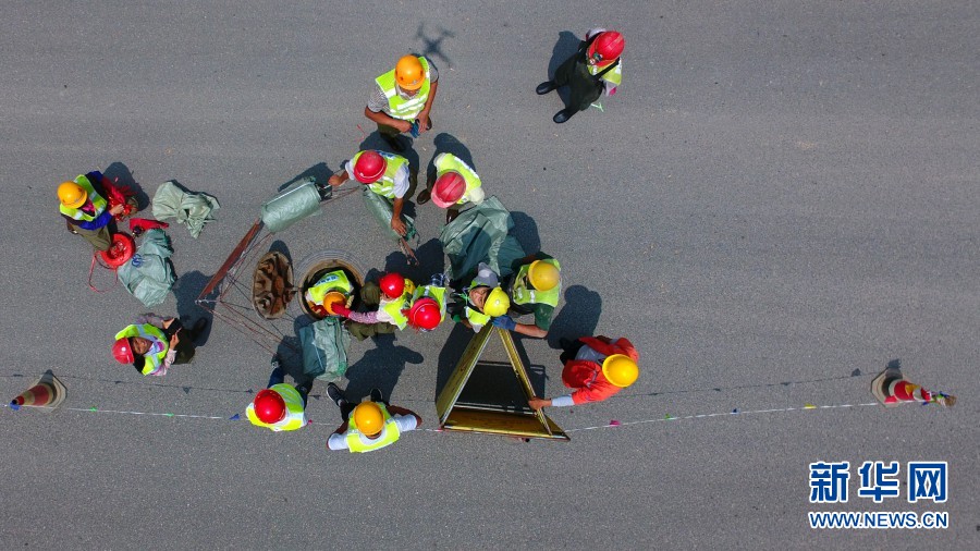 航拍管道清淤工作者下井。(新华网 赵普凡 摄)