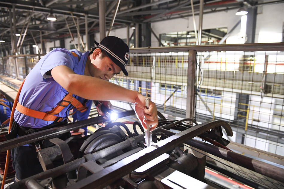 “动车医生”用游标卡尺测量车顶受电弓部件的宽度(10月2日摄)。 国庆长假期间,动车、高铁开行密度较平时有所增加。当夜幕降临,随着一列列结束运营的动车、高铁陆续返回,中国铁路南宁局集团有限公司南宁车辆段南宁动车所检查库里的地勤机械师们也变得忙碌起来,他们像医生一样对列车进行全方位检修保养,确保车辆第二天可以正常运行。 新华社记者 曹祎铭 摄
