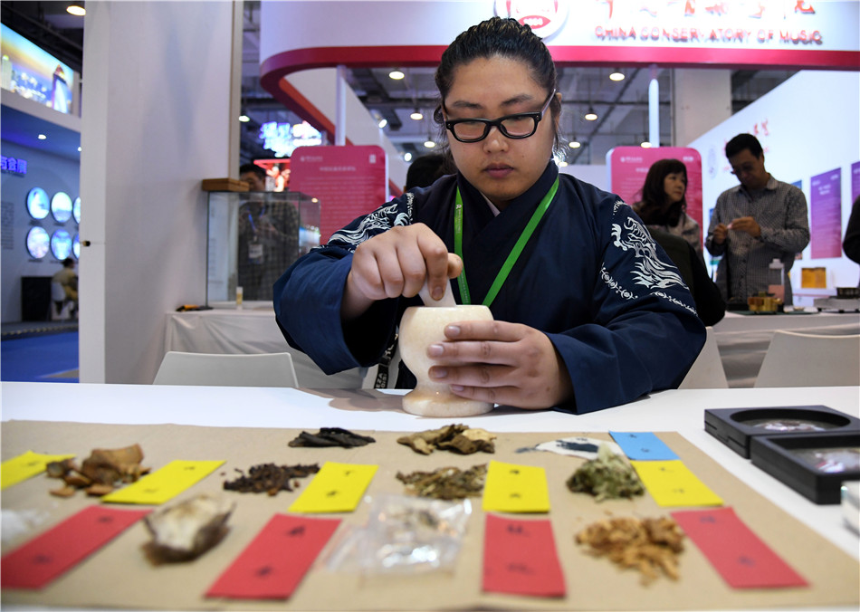 10月27日,一名技师在展会上制作手工香料。 2019中国(青岛)艺术博览会10月25日至27日在青岛国际会展中心举行。艺博会上,国内多所艺术院校和艺术研究机构设置了文物修复、古法篆刻、传统乐器等手工制作展台,邀请专业人士进行现场制作和演示,观众可以近距离了解传统手工技艺的精湛。 新华社记者李紫恒摄