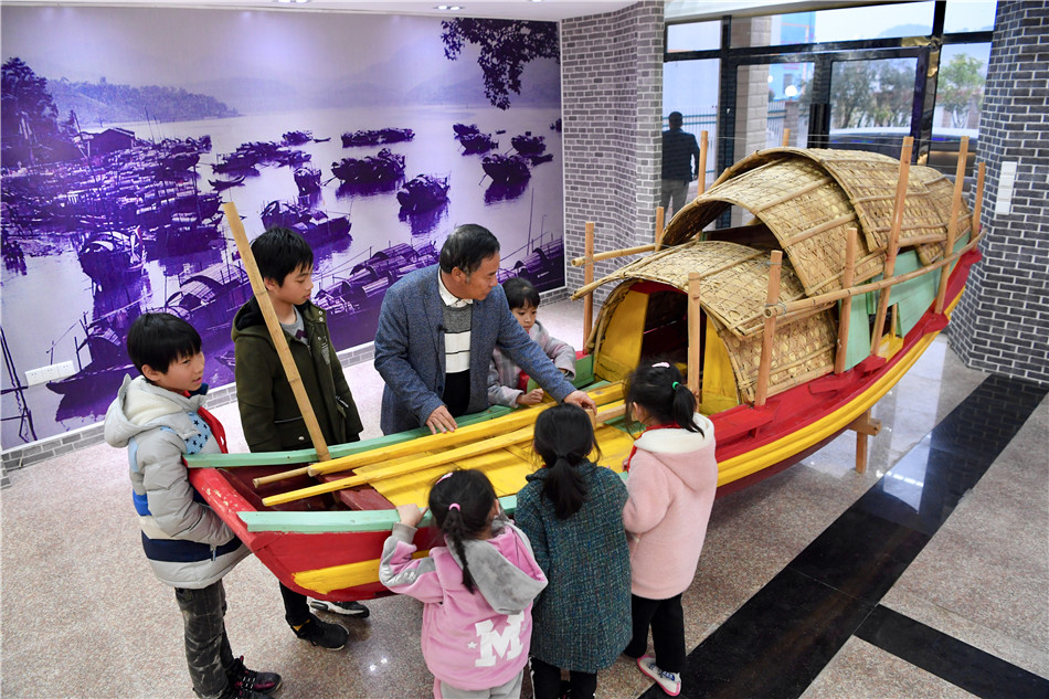 宁德福安市溪邳村党支部书记江宽全在村展览馆向村里儿童介绍老一辈船民的海上生活(3月7日摄)。新华社记者 姜克红 摄
