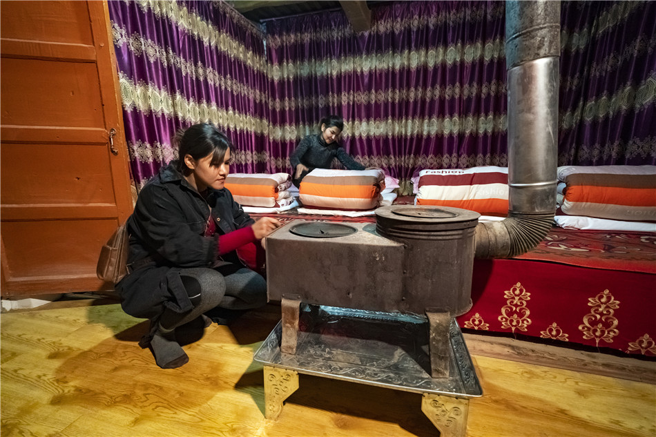 在地处塔克拉玛干沙漠腹地的新疆于田县达里雅布依乡,库尔班罕·买提肉孜(左)帮助一户旅游合作社成员整理民宿,准备接待外地来的游客(11月13日摄)。 新华社记者 沈伯韩摄