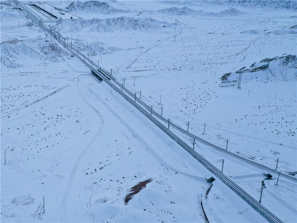 这是12月15日无人机拍摄的塞什腾山附近敦煌铁路铁道。 12月18日,随着肃北至马海区段通车,敦煌铁路全线开通运营,中国西北地区形成首条环形铁路网。 新华社记者 张龙 摄