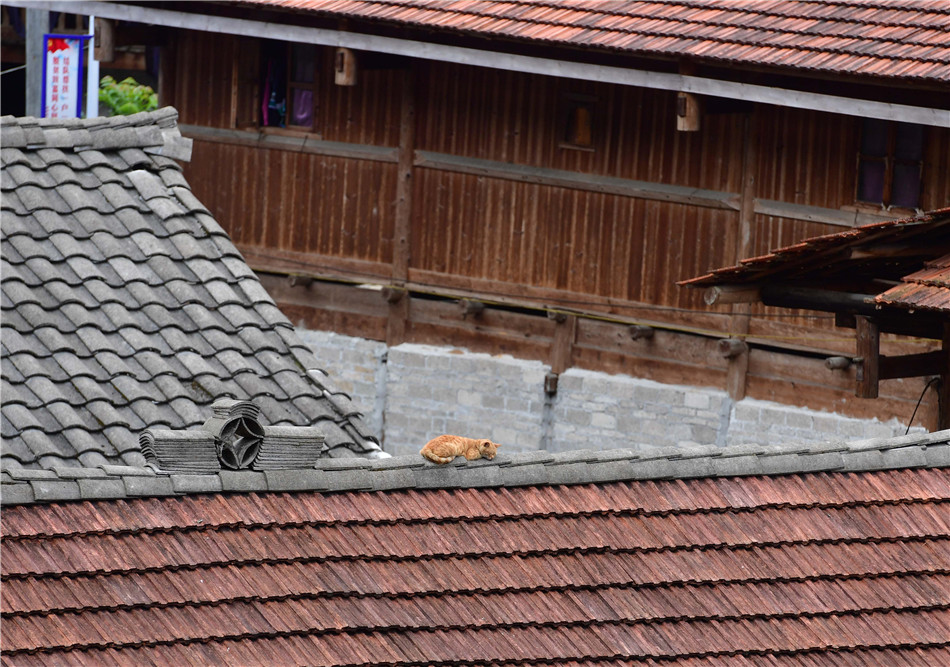 乌英苗寨的一只猫在屋顶睡觉(9月2日摄)。 新华社记者 黄孝邦 摄