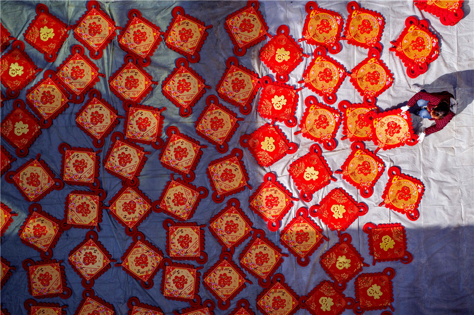 在河北省邢台县晏家屯镇心长村扶贫小院,村民晾晒、整理手工饰品(11月18日无人机拍摄)。晏家屯镇结合脱贫攻坚工作实际和贫困群众需求,实施“扶贫小院”工程,带动200余名群众通过手工艺品制作、花卉种植等多个行业实现就业增收。 新华社记者 牟宇 摄