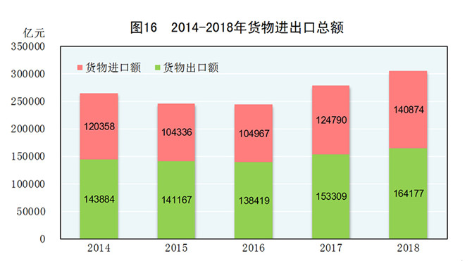 全年货物进出口总额305050亿元,比上年增长9.7%。其中,出口164177亿元,增长7.1%;进口140874亿元,增长12.9%。货物进出口顺差23303亿元,比上年减少5217亿元。对“一带一路”[49]沿线国家进出口总额83657亿元,比上年增长13.3%。其中,出口46478亿元,增长7.9%;进口37179亿元,增长20.9%。