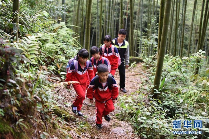 5月9日放学后,周正文(后)护送学生回家。新华社记者 杨文斌 摄