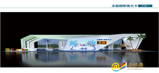 开幕式大厅及主题国、主宾国馆。主题国斯里兰卡馆,设计方案主造型以宝石切割面为设计灵感源,造型以点、线、面分层次,抽象塑造宝石体积感。整体造型富有张力、展区风格现代。目前,主宾国柬埔寨馆设计方案正在商议。