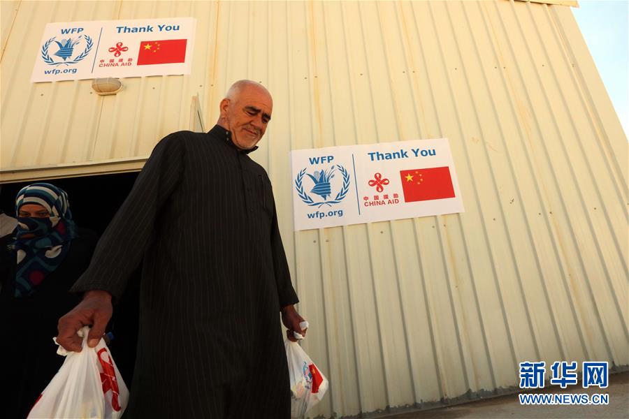 2017年3月5日,在约旦扎塔里难民营,叙利亚难民从联合国世界粮食计划署的仓库中领取中国政府援助的食品。 新华社发(穆罕默德·阿布·古什摄)