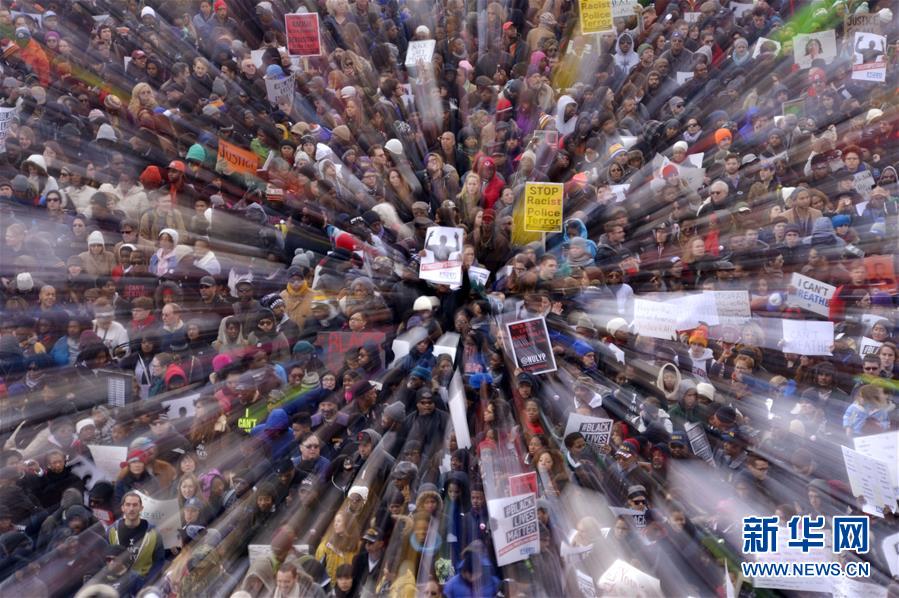 2014年12月13日,在美国首都华盛顿的宾夕法尼亚大街,人们参加游行示威。当日,近万名示威者在华盛顿举行集会和游行,抗议暴力执法和种族歧视。新华社记者 殷博古 摄