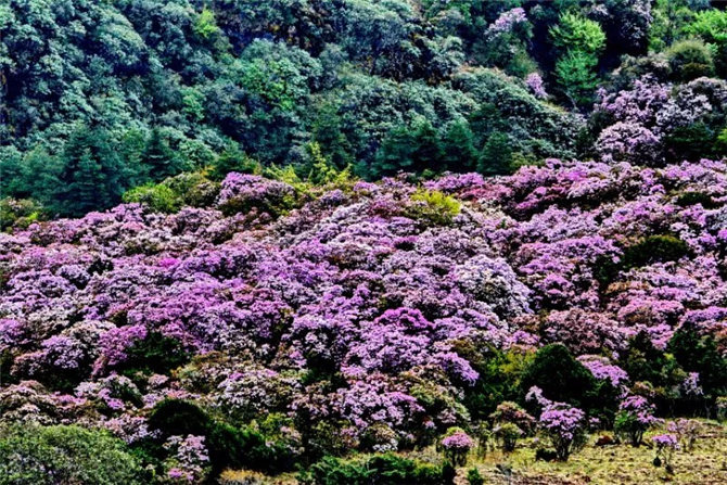 到了四方景,那才是“烟云凝艳万山丛,胜似朝霞比彩虹”。四方景是每年轿子雪山杜鹃花最早盛开的地方。大片大片的各色的杜鹃花竞相盛放,占满了满满山头,原本雄伟壮丽的轿子雪山,突然摇身一变,变身为俏丽动人的少女。