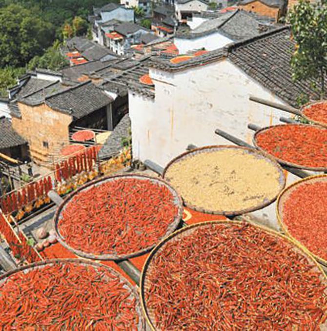 在江西省婺源县篁岭古村,晒秋美景吸引了四面八方的游客慕名而来。影像中国