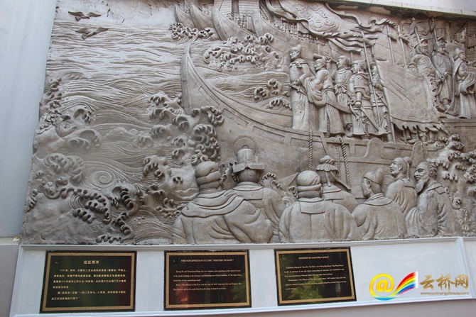 三宝洞用中文、印尼文和英文3种文字介绍的郑和下西洋故事的浮雕