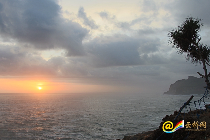 不知不觉间太阳已偏西,在水天间的巨幕上泼洒着红的、橘黄的绚烂色彩,光柔柔地洒在海面上,洒在岛上,让人的心境也静静平和下来。这时,我才注意到一块崖石上坐着一个戴着黄色头巾,穿着红色衣裙的女子,她静静地注视着眼前的一切。我不知道她这样静坐了多久,也看不到她的面容,凝视着她的背影,让我感觉到这是一个有故事的女人,也许她正沉浸在回忆中,这里是她和爱人盟誓牵手之地,太阳、大海见证了他们的浪漫多情;又或许她正独自垂泪,让大海把生活中的种种不愉快从心中冲涮掉,重新出发邂逅一段新情缘……霎时间,在我眼里,天王岛不仅仅是勇者的挑战之地,也是一座浪漫之岛。
