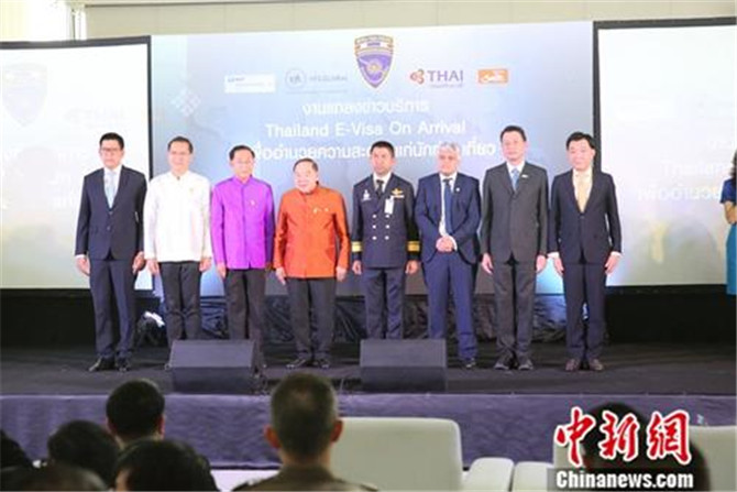 1月29日,泰国移民局在曼谷素万那普机场举行新闻发布会宣布,将于2月14日向包括中国在内的21个国家和地区游客推出全新电子落地签证系统。图为出席发布会嘉宾合影。中新社记者 王国安 摄