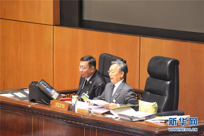 6月5日,在泰国曼谷,泰国国会主席川·立派(右)在新一届国会上下两院第一次常务会议上宣布巴育当选为泰国新总理。新华社记者杨舟摄