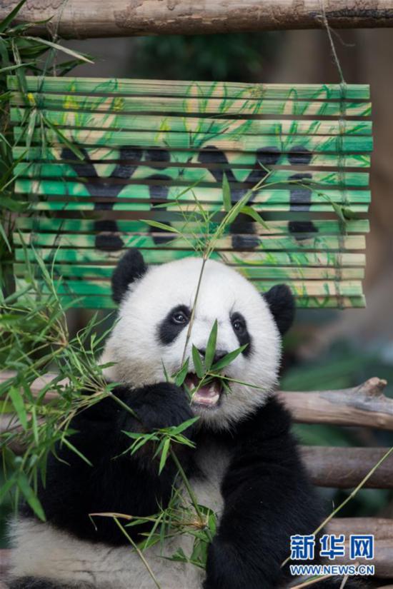 8月1日,在马来西亚吉隆坡附近的马来西亚国家动物园,大熊猫宝宝“谊谊”在写有自己名字的竹简旁吃东西。 当日,马来西亚将在马出生的第二只雌性大熊猫宝宝取名为“谊谊”。“谊谊”是中国旅马大熊猫“兴兴”和“靓靓”所生的第二只大熊猫宝宝,于2018年1月14日出生。 新华社记者朱炜摄