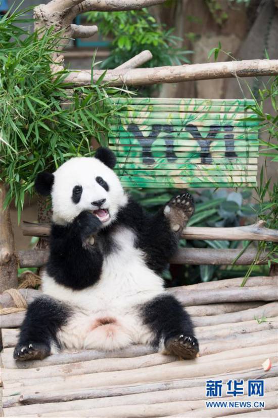 8月1日,在马来西亚吉隆坡附近的马来西亚国家动物园,大熊猫宝宝“谊谊”在写有自己名字的竹简旁吃东西。 当日,马来西亚将在马出生的第二只雌性大熊猫宝宝取名为“谊谊”。“谊谊”是中国旅马大熊猫“兴兴”和“靓靓”所生的第二只大熊猫宝宝,于2018年1月14日出生。 新华社记者朱炜摄
