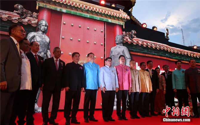 9月15日,嘉宾合影。当天,“秦始皇——中国第一个皇帝与兵马俑”展览在泰国曼谷国家博物馆开幕。泰国副总理威萨努、副总理兼卫生部长阿努廷、中国驻泰国大使吕健、泰国文化部部长伊提蓬等出席开幕式并参观展览。 这是被誉为“世界第八大奇迹”的秦兵马俑首次在泰国展出,共展示文物86件(组),其中一级文物有17件(组)。展览将持续至12月15日结束。中新社记者 王国安 摄
