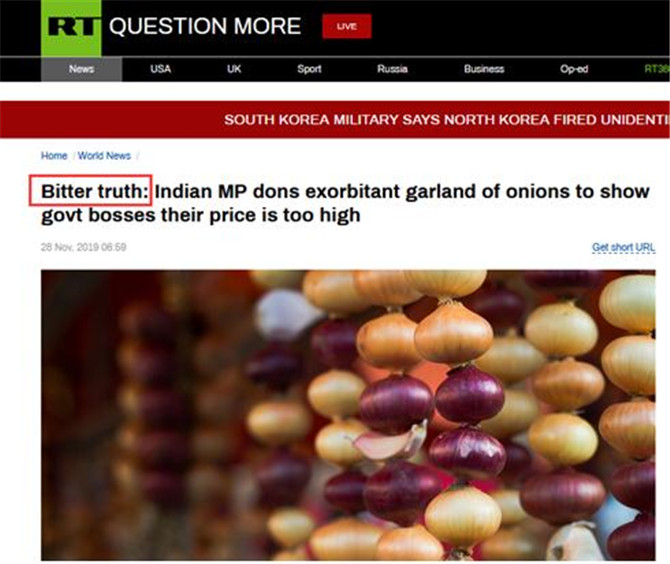 为抗议印度比哈尔邦政府未能解决洋葱价格飙升问题,当地反对党议员拉姆近日出席一场议会听证会时,戴上了一串“洋葱花环”。据“今日俄罗斯”(RT)28日透露,拉姆的这一“操作”登上了不少印度当地媒体的头条。而在RT的报道中,这则消息被形容为“苦涩的真相”(Bitter truth)。