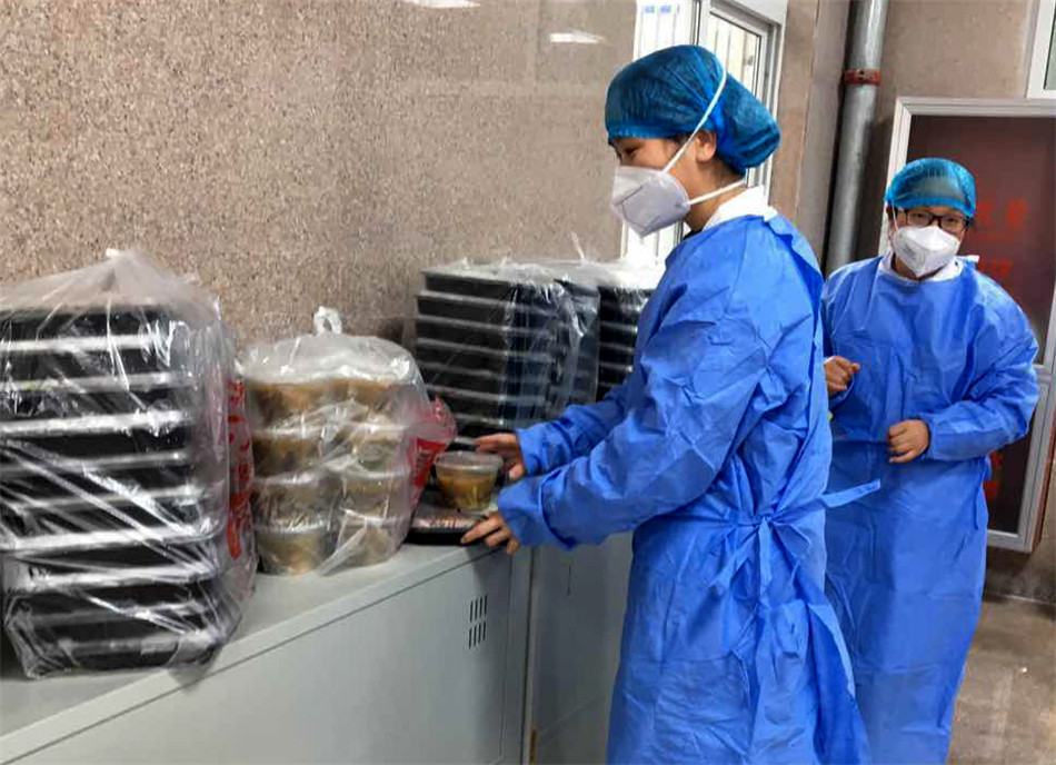 2月6日,隔离病房医护人员在取餐。 新华社发(郝源 摄)