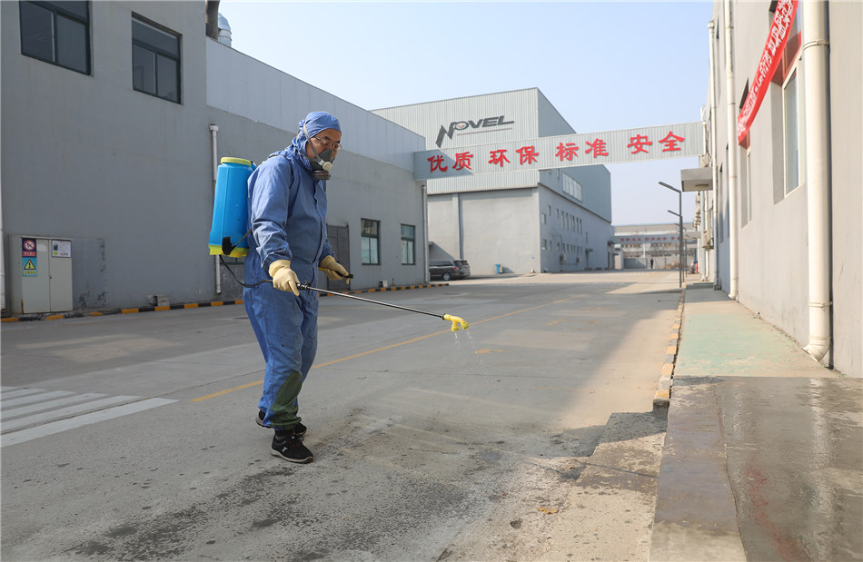 2月11日,在石家庄鹿泉区一家包装产品企业,工人在厂区进行消毒作业。 近日,各地企业采取多项举措一手抓疫情防控、一手抓复工复产。 新华社发(许建园 摄)