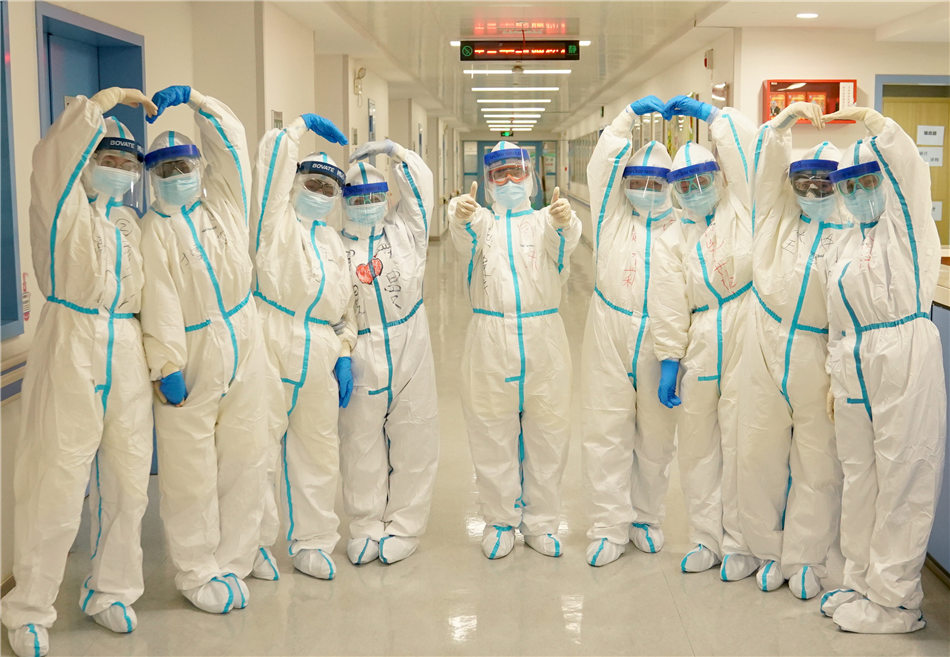 华中科技大学同济医学院附属同济医院中法新城院区C栋10东新冠肺炎重症病区的部分护士合影(2月18日摄)。 新华社记者 王毓国 摄