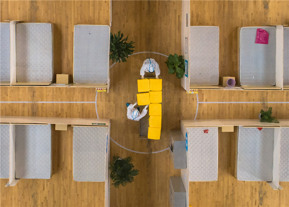 3月8日,工作人员在舱内进行清理作业(无人机照片)。 当日,武汉体育中心方舱医院送走最后一批痊愈患者,正式休舱。随后,舱内将进行全面消毒工作。 新华社记者 肖艺九 摄