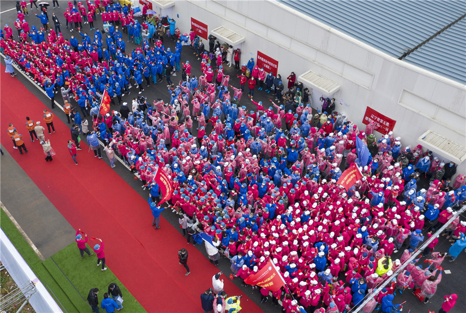 3月29日,医护人员参加在武汉雷神山医院举行的集中撤离仪式(无人机照片)。 当日,武汉雷神山医院举行首批外省医疗队集中撤离仪式,送别即将踏上归途的辽宁、上海、吉林、广东、山西、河北医疗队的1090名医护人员。 新华社记者 才扬 摄
