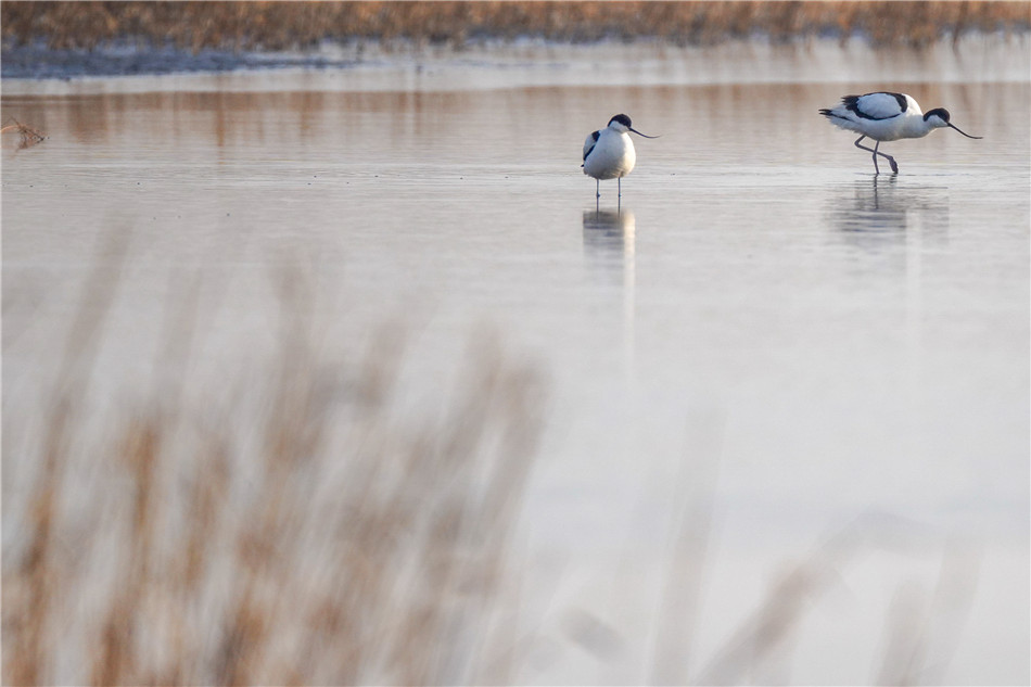 4月9日,在位于吉林省白城市镇赉县的莫莫格国家级自然保护区,两只反嘴鹬在湿地觅食。 随着气温回暖,位于吉林省白城市镇赉县境内的莫莫格国家级自然保护区迎来候鸟北归高峰期。近两千只白鹤,数万只大雁、野鸭等在此停歇休养,补给觅食。 新华社记者 张楠 摄