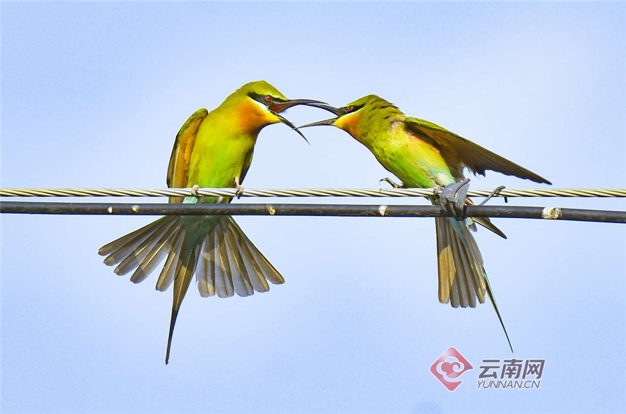 4月8日下午,保山青华海国家湿地公园管理中心的工作人员在东河边开展鸟类监测的时候,发现了一群30只左右的栗喉蜂虎。它们时而停留在河边的电线或柳树枝头上,时而欢快跳跃于低矮灌木丛中,时而于飞翔中捕食蜻蜓、蛾子等昆虫。这是自2019年以来栗喉蜂虎第2次来到青华海,而且这次的种群数量比去年多了很多。
