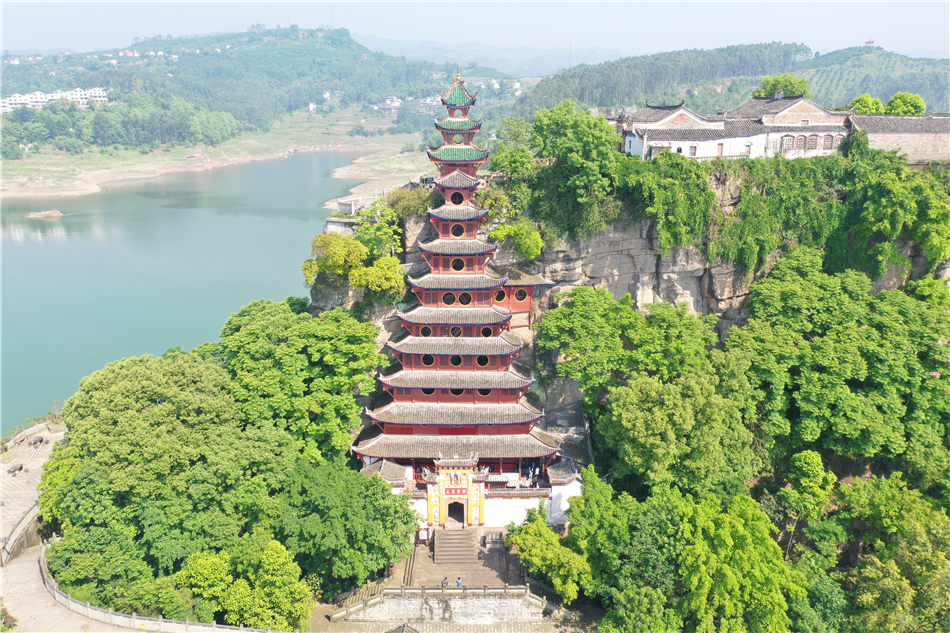 这是4月28日拍摄的石宝寨塔楼(无人机照片)。 位于重庆市忠县境内的石宝寨,是长江三峡景区中一个独特的景观,有着“江上明珠”之称。 新华社记者 唐奕 摄