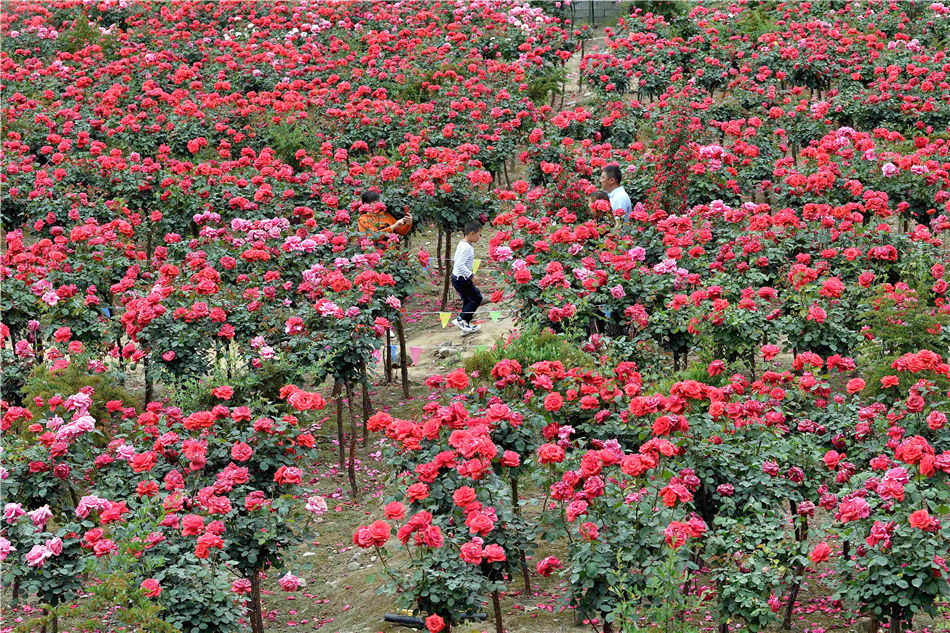 5月5日,游客在湖北省襄阳市保康县寺坪镇简家坪村的月季园观赏游玩。 据文化和旅游部的统计数据,5月1日至5日,全国共计接待国内游客1.15亿人次,实现国内旅游收入475.6亿元。 新华社发(杨韬摄)