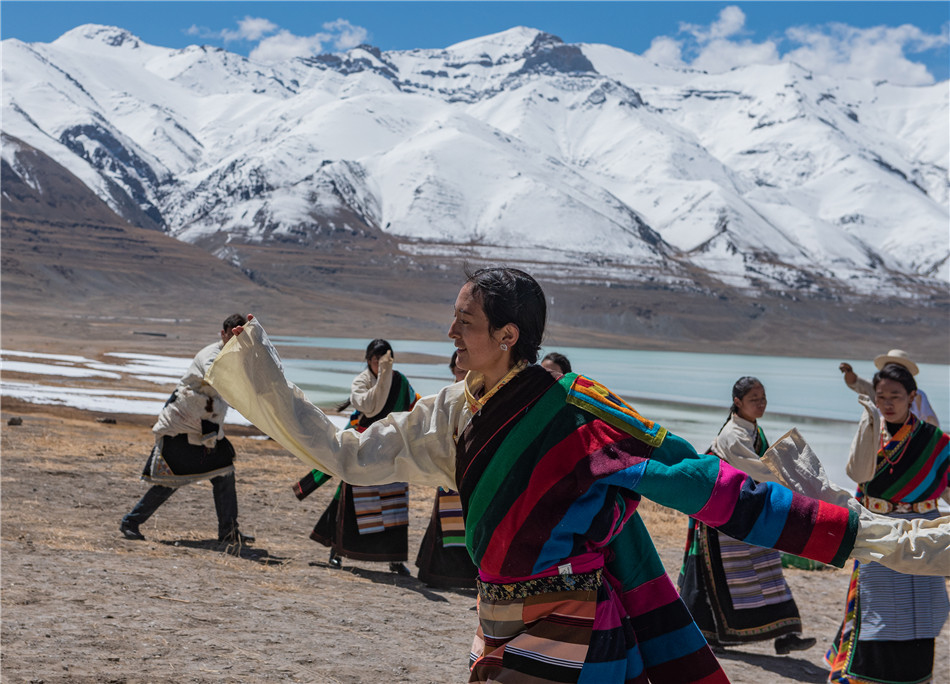 村民们在西藏那曲市尼玛县当穹错旁举行的春耕典礼上跳锅庄舞(4月30日摄)。新华社记者 田金文 摄
