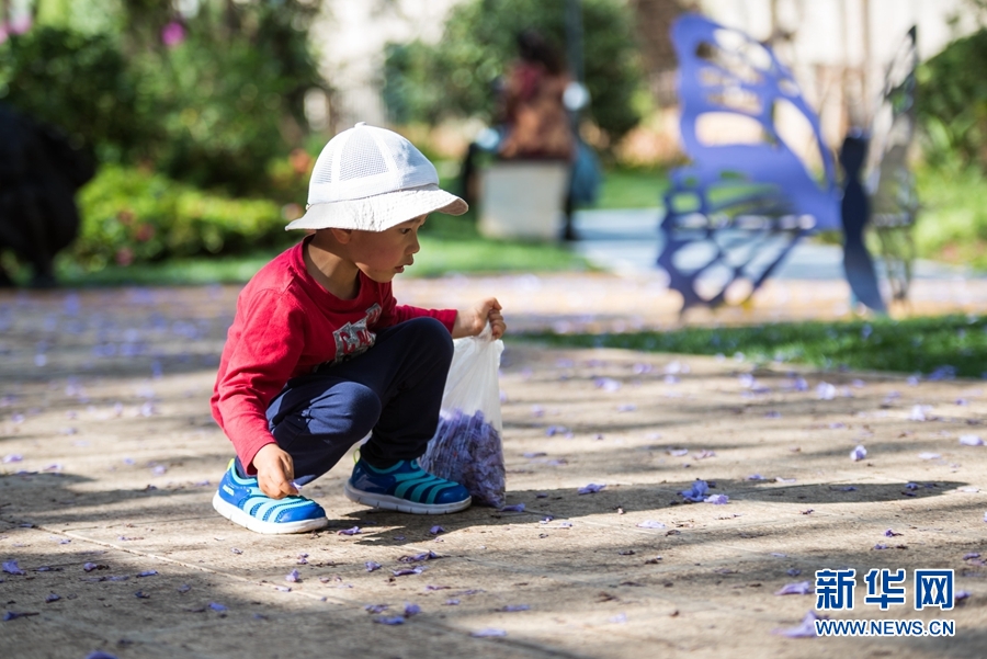 小朋友在收集地上的落花(5月6日摄)。新华网发(李明/摄)