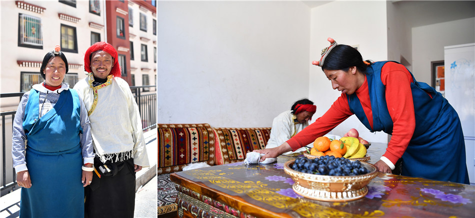 拼版照片:左图为西藏昌都市八宿县拥巴乡娜帕村村民布贡(右)和妻子益西琼措在安置点楼前;右图为在八宿县乃然易地扶贫搬迁安置点,益西琼措在家里打扫卫生。2018年,布贡一家人搬迁到乃然易地扶贫搬迁安置点,住进了三室一厅的新居。和布贡一家一样,八宿县拥巴乡、夏里乡、瓦乡的2000余名群众完成易地搬迁,开启美好的新生活(5月10日摄)。新华社记者 詹彦 摄