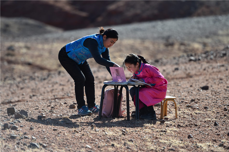 9岁的策耿(右)在家附近的戈壁上上网课(4月1日摄)。策耿是内蒙古自治区阿拉善左旗蒙古族学校四年级学生。由于疫情防控,策耿父母长期雇佣的一名外省羊倌没能回到当地,一家人只好回到阿拉善左旗乌力吉苏木温都尔毛道嘎查的牧区家中照看羊群。期间,策耿一边协助父母,一边上网课。 新华社记者 刘磊 摄
