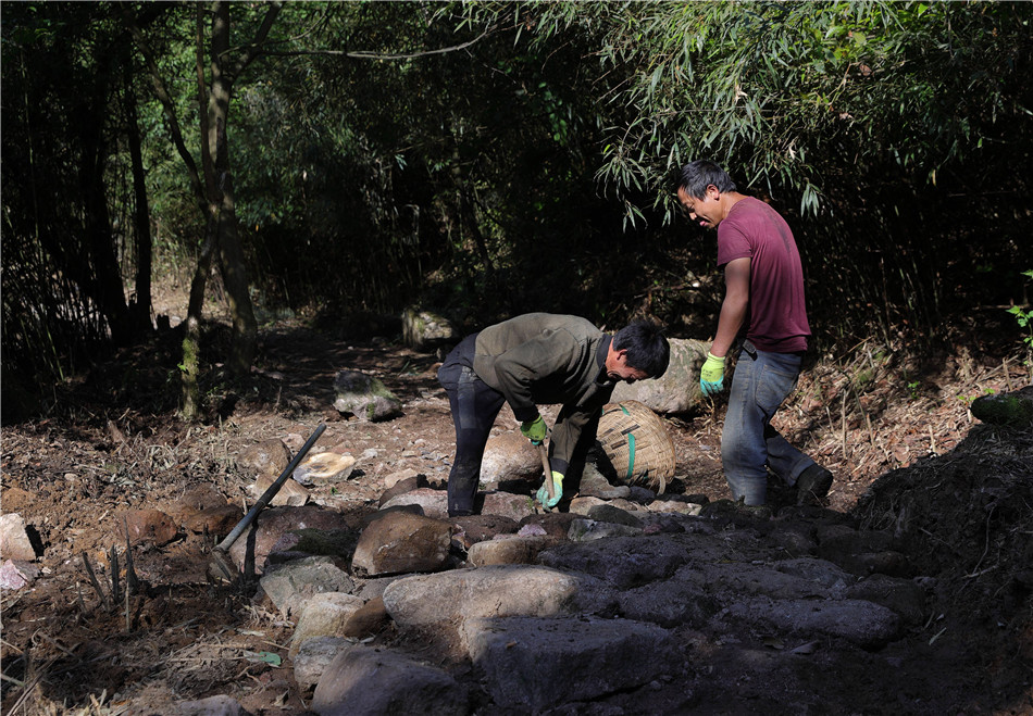 5月25日,工人在修复大相岭茶马古道。新华社记者 江宏景 摄