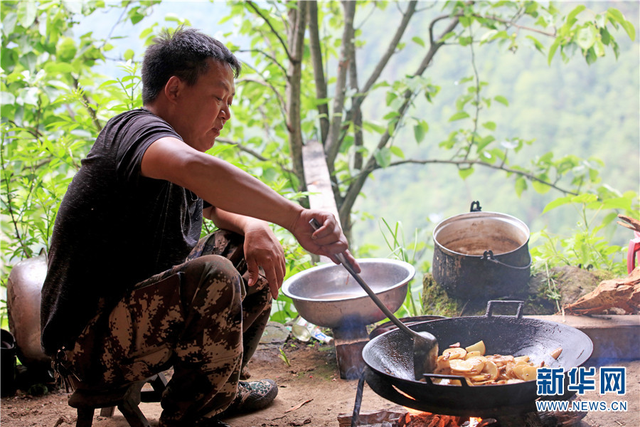 村民靠种苞谷、豆子等作物糊口,每年春节过后好多人家就断了粮,只能四处借粮,甚至找野菜度日。图为余友邓在生产房里做饭(5月13日摄)。