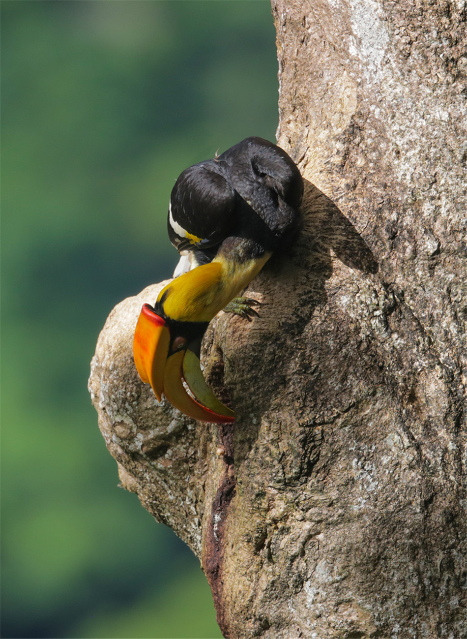 双角犀鸟成鸟给巢穴内的雏鸟喂食(7月6日摄)。 新华社发(朱边勇 摄)
