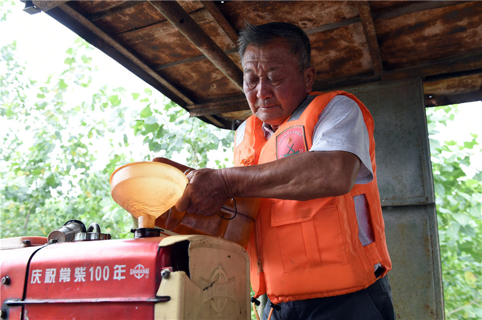 7月20日,在安庆市海口镇,王启干给渡船添加柴油。新华社记者 周牧 摄