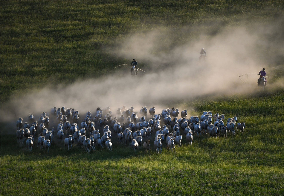 7月31日,套马手正在套马。 当日,内蒙古西乌珠穆沁旗在巴彦胡舒苏木白马繁育基地的草原上进行套马活动,向广大游客展示套马技艺和草原民俗文化。