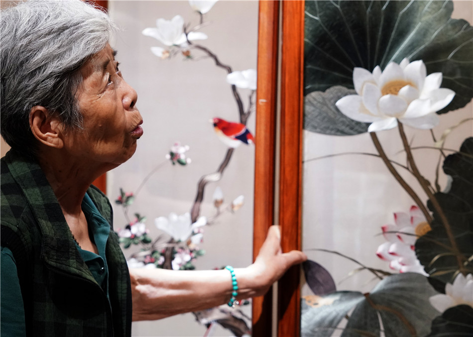 在开封市素花宋绣工艺有限公司的展示馆里,王素花在观看自己的刺绣作品(7月30日摄)。新华社记者李嘉南摄
